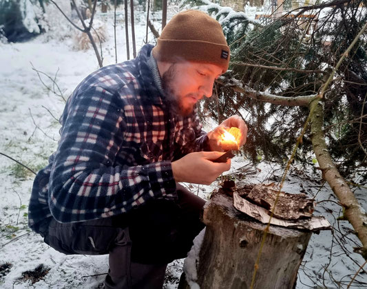 Schön, dass du da bist! Ich bin Tobias und ich freue mich darauf, wieder das Feuer für den Ruf der Wildnis mit & in dir zu entfachen. Überhaupt ist die Arbeit mit unseren Elementen schon von Kindheit auf meine Leidenschaft. Groß geworden in den Wäldern des Erzgebirges, gehörten tagtägliche Streifzüge durch heimische Flure zur guten Kinderstube. Über Stock und Stein, durch Flüsse und dabei immer hoch hinaus. Nichts, was nicht erklettert blieb. Suchte man mich als Kind, war ich in der Regel ganz oben „auf der großen Fichte vorne links zu finden“. Der Wald mit und auf all seinen Ebenen - mein zweites Wohnzimmer, mein Zuhause. Eingetaucht in das spätere Berufsleben, absolvierte ich nebst anderen Abschlüssen auch meine Fachausbildung zum Verfahrensmechaniker. Bis heute gibt mir dieses Feld der Arbeit einen großen Spielraum meinen Umgang mit verschiedenen Materialien zu vertiefen. Konstruieren, programmieren, umarbeiten, reparieren, sowie die ganzheitliche Kommunikation mit unterschiedlichen Menschen, gestalten meinen Arbeitsalltag vielseitig. Klettere ich auch heute, als Familienvater, nicht mehr ganz so hoch hinaus, ist mir die Natur doch unverändert und unabdingbar ein absoluter Ausgleich geblieben. Ich fühle mich im Draußen Zuhause...Frische Luft....raus aus dem krübelnden Denken, um den Kopf frei zu bekommen. Rein ins Tun, um mit meinen Händen zu (er)schaffen und zu arbeiten, getreu dem Motto - „geht nicht, gibt’s nicht“! Bewährtes Wissen weitergeben. Erfahrungen austauschen und Verbindung mit mir, oder in Gemeinschaft inmitten der Wildnis zuschließen. Neues probieren. Dadurch auch Grenzen austesten, oder überwinden. All diese Aspekte und Ankerpunkte, die mich in meinem Alltag erden - finde ich mit und in der Natur. Ein besonderes Gefühl der Freiheit überkommt mich dabei immer, sobald ich mit dem kraftvollen Element Feuer arbeiten kann. Die Möglichkeiten zu kennen & anwenden zu können, um eine Flamme entstehen zu lassen und die Sprache des Feuers zu verstehen, geben mir einfach unglaublich viel Kraft und Freude . Es bestärkt mich in meiner inneren und äußeren Gesundheit. Das Kochen über offener Flamme und unter freiem Himmel, ist auch in unserem Familienalltag nicht mehr wegzudenken. Ein fester Bestandteil, der unsere Familie im Kern nährt. Mit tragender Erde unter den Füßen, frischer Luft in der Lunge, einem Weg zu fließendem Wasser und einem warmen Feuer – bleibt stets das Bewusstsein, belastbar und widerstandsfähig, wie die Elemente selbst, immer dem Ruf der Wildnis zu folgen. Also, lass dich rufen und dein Feuer wieder entfachen!